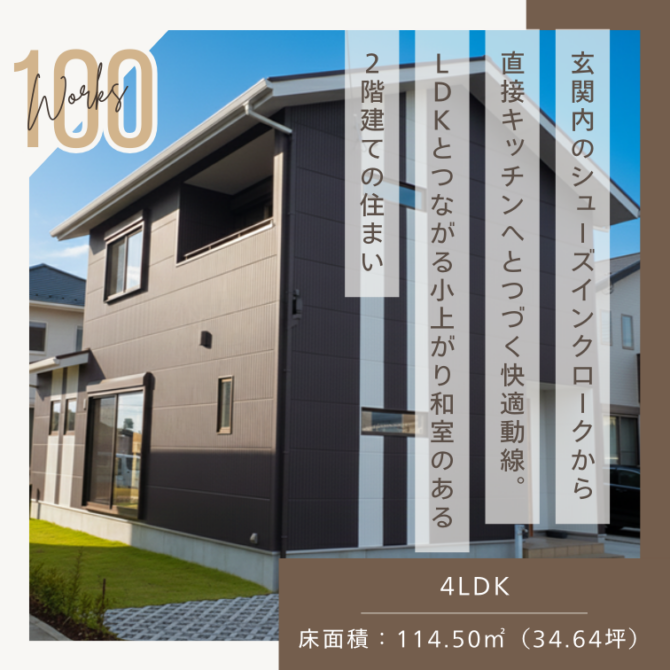 施工事例100 「玄関内のシューズインクロークから直接キッチンへとつづく快適動線。LDKとつながる小上がり和室のある2階建ての住まい」
