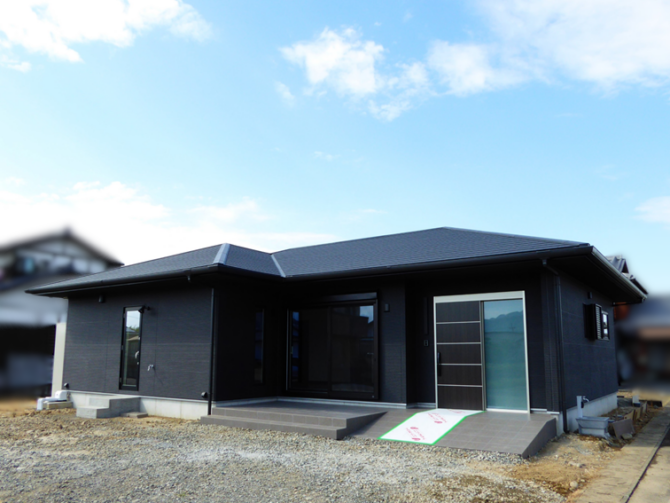 ブラック外壁色と重厚感のある寄棟屋根が、