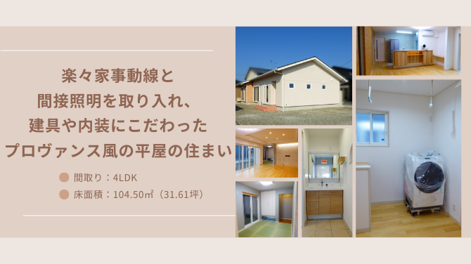 施工事例116 「楽々家事動線と間接照明を取り入れ、建具や内装にこだわったプロヴァンス風の平屋の住まい」