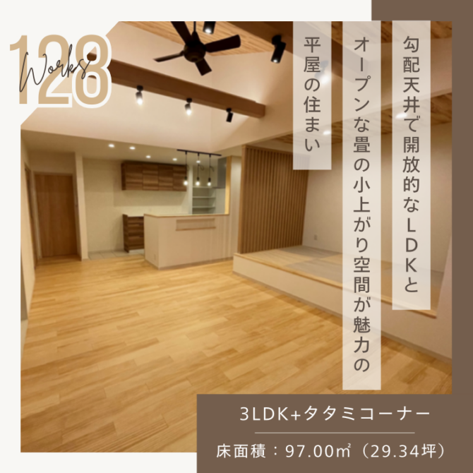 施工事例128 「勾配天井で開放的なLDKとオープンな畳の小上がり空間が魅力の平屋の住まい」