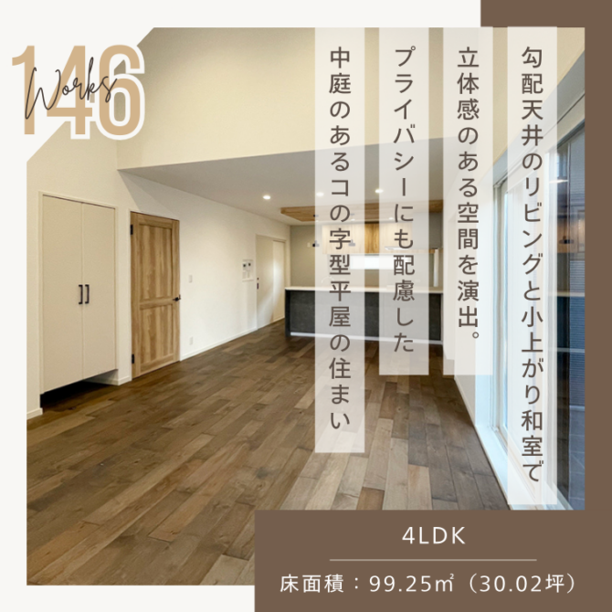 施工事例146「勾配天井のリビングと小上がり和室で立体感のある空間を演出。プライバシーにも配慮した中庭のあるコの字型平屋の住まい」