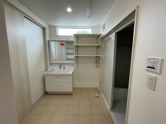 洗剤やタオルを置くのに便利な可動棚を設置しました。