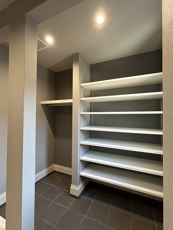 《曲線美が彩る、キッチン横の大容量パントリー》
