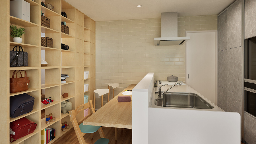 3人分のランドセルに登園鞄、夫婦の通勤鞄も。毎日使う散らかりがちな荷物も、両面から使える2WAY収納ですっきり片付く。あとで2階に持っていくものの“仮置き場”としても。