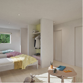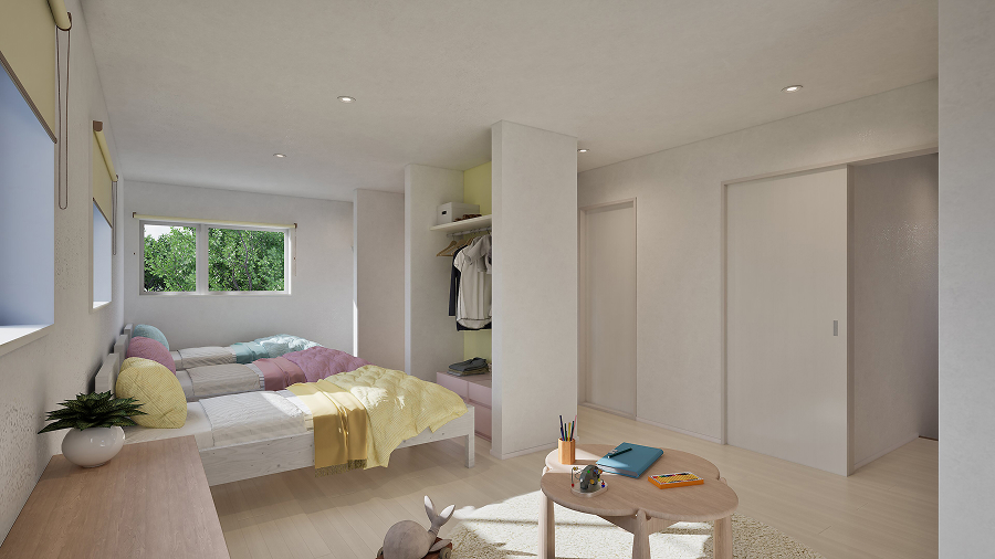 広々使えるフリースペースは、子どもの成長に合わせて個室へと分割が可能。小さいうちはプレイルームとして活用し、大きくなったら3人が思い思いの時間を過ごせる空間に。