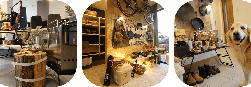 見せる収納の有孔ボードが大活躍!アウトドアギアのメンテナンスがゆっくり室内でできます。