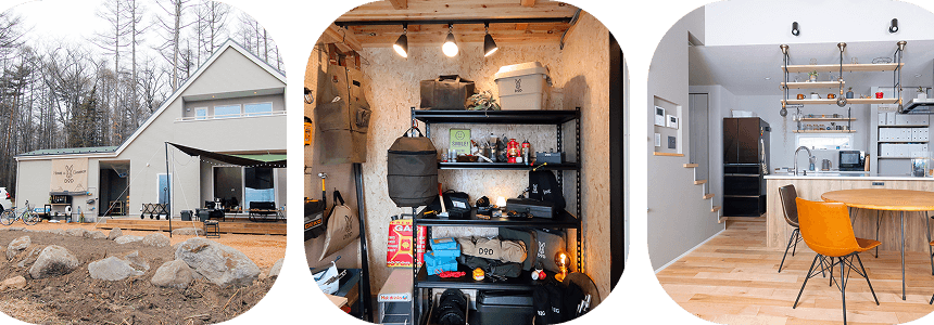 天気を気にせずに、「車からガレージ、車から家の中へ」荷物の出し入れがしやすい動線が特徴!キャンプ後のテントなどを干せる工夫も◎