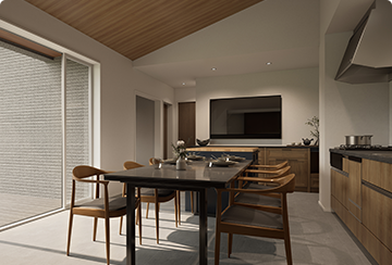 畑で採れた野菜を料理し、ふたりでゆっくり味わう時間が日常に。家族や友人を招く日は、ダイニングが語らいとおもてなしの中心の場となります。