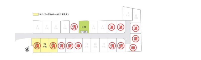 | 条件等 | 建築条件付宅地分譲:土地売買契約後ただちに建築協議をしていただき、3か月以内にユニバーサルホーム ㈱コスモスと建築請負契約を結ぶことを条件に販売いたします。 この期間内に建築しないことが確定したときには、土地売買契約は白紙となり、受領した金銭は全額無利息でご返還いたします。 ※確定測量後、面積に若干の増減が発生する場合がございます。予めご了承ください。 |