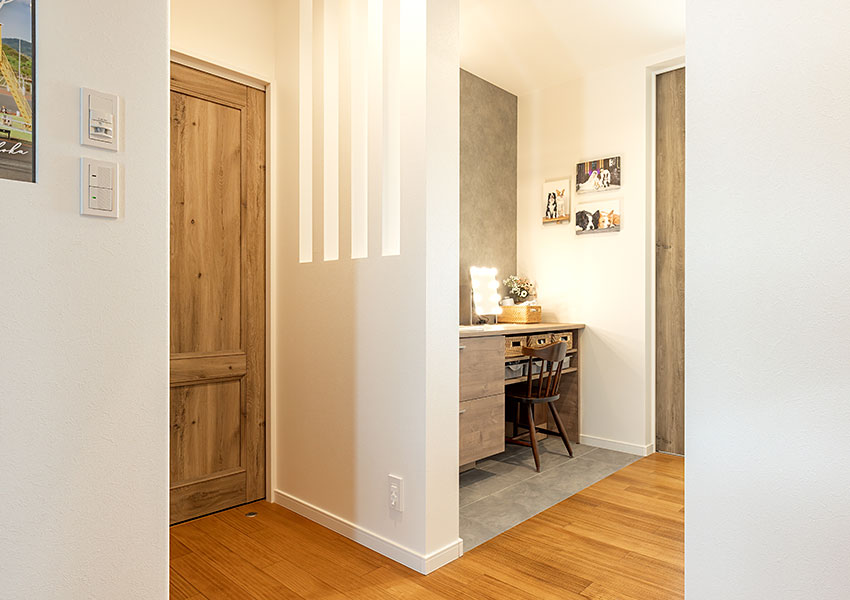 職人の手仕事による格子状の仕切りや、2階の主寝室から1階のドッグスペースの様子をみることができる室内窓など、細部にまでこだわりが詰まった住まい。