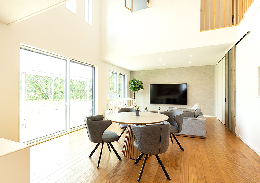 約30畳の広さを確保したLDKは、家族の暮らしにゆとりをもたらす空間。北向きに配置されたリビングは、敷地が小高い場所にあるため、柔らかな自然光が一日を通して差し込み、明るさを感じられる設計です。