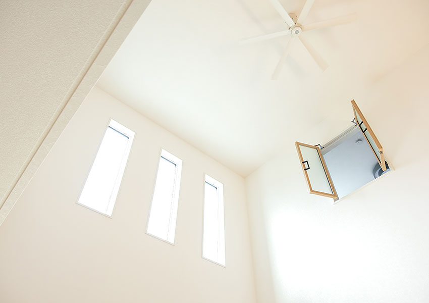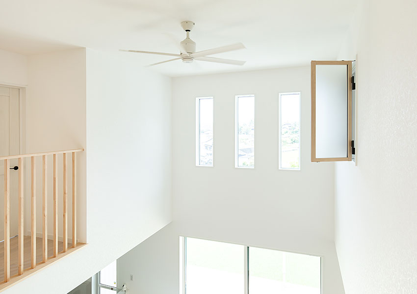 「吹き抜けは憧れでした。LDKの上は8帖ほどの大きな抜き抜けで、2階から見下ろすリビングの景色はお気に入りです。犬たちがドッグスペースからぴょこっと顔を出す仕草がみられるなど、可愛いですね。開放感あふれる間取りのおかげでどこに居ても楽しく過ごせています」
