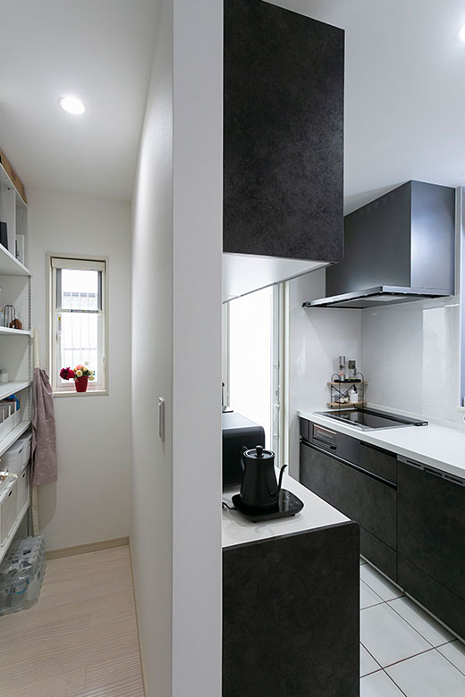 キッチンは「料理をしながらテレビを見たい」というご夫婦の希望に合わせて配置を工夫。モデルハウスと同じキッチンを採用し、シンクが見えにくく、調味料などを収納できる設計になっています。キッチン裏には冷蔵庫も置ける大容量のパントリーを設け、ストック品もすっきり収納。
