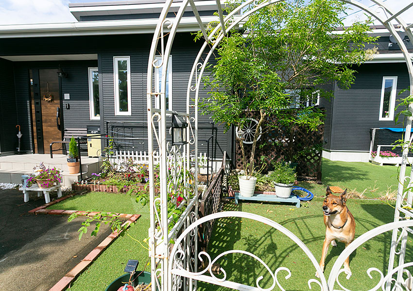 ダークトーンの外壁に白枠の窓が映える外観は、可愛らしさと落ち着きを兼ね備えています。緑豊かなお庭では、愛犬とのびのびと過ごす時間が日常の一部になっています。
