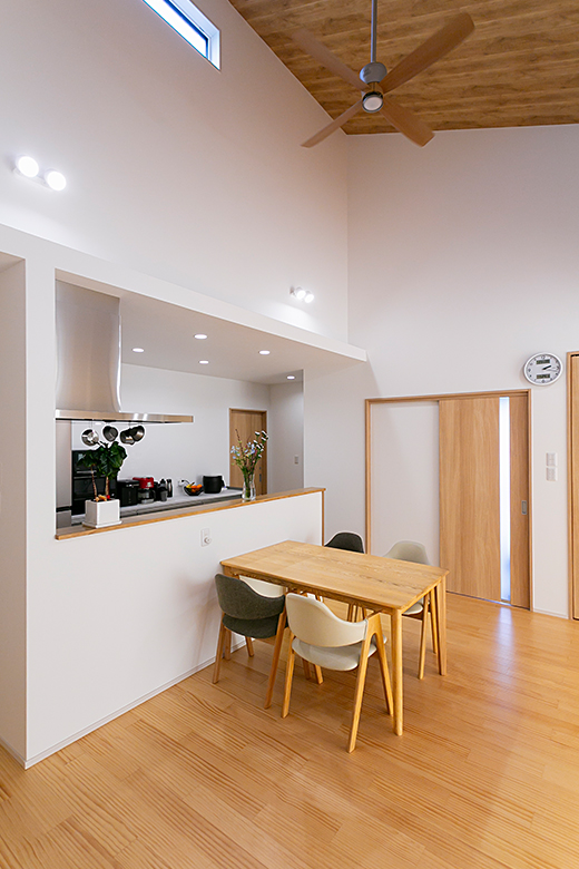 LDKは大きな窓と、屋根形状を生かした勾配天井により、隅々まで陽の光が届く開放的な空間です。